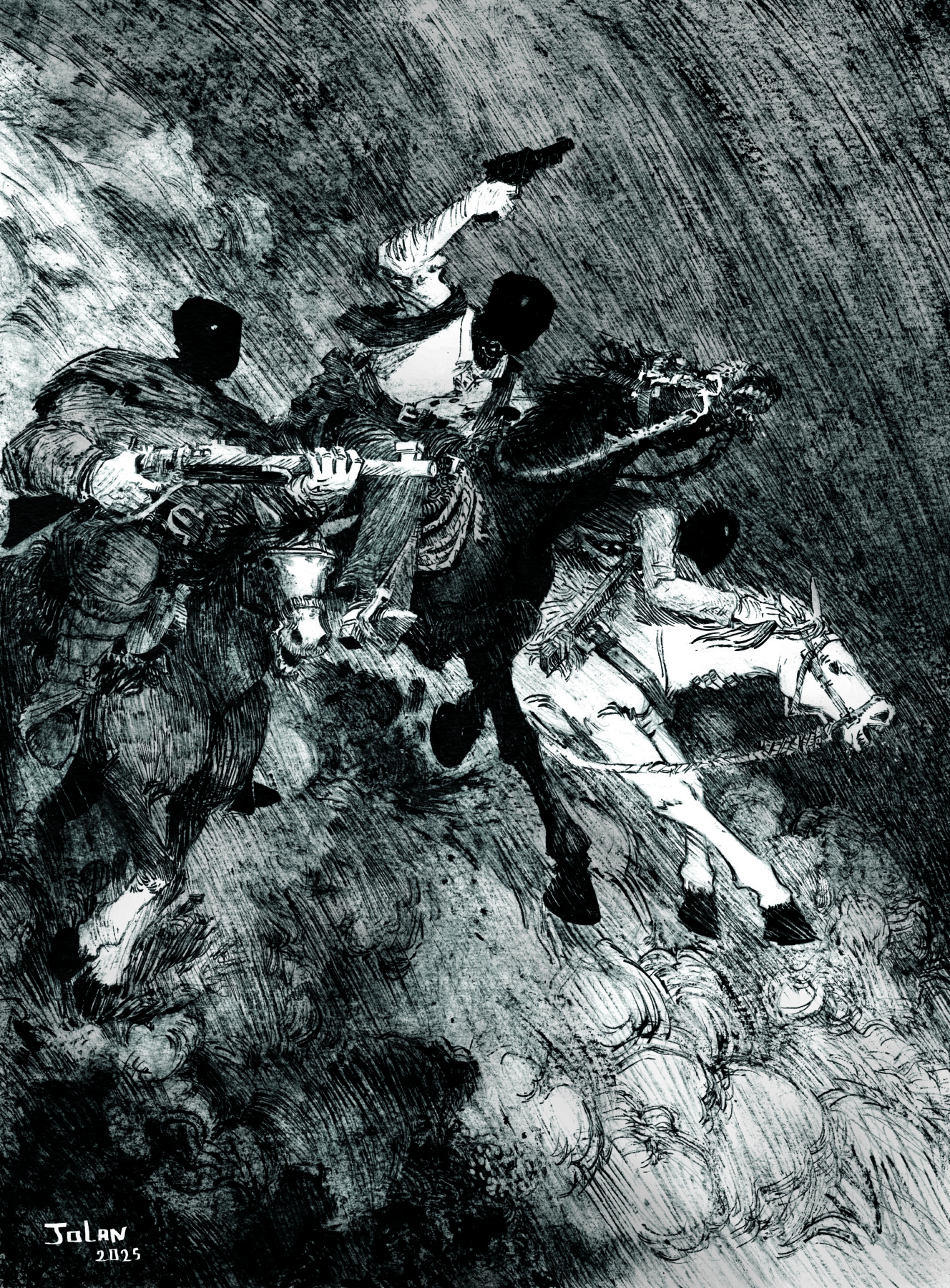 Cette première œuvre du jeune auteur bordelais Jolan THOMAS est un récit engagé, aux thèmes aussi variés que les ambiances qui le portent. Son style graphique se démarque par un trait riche, brut, au rendu proche de la gravure.